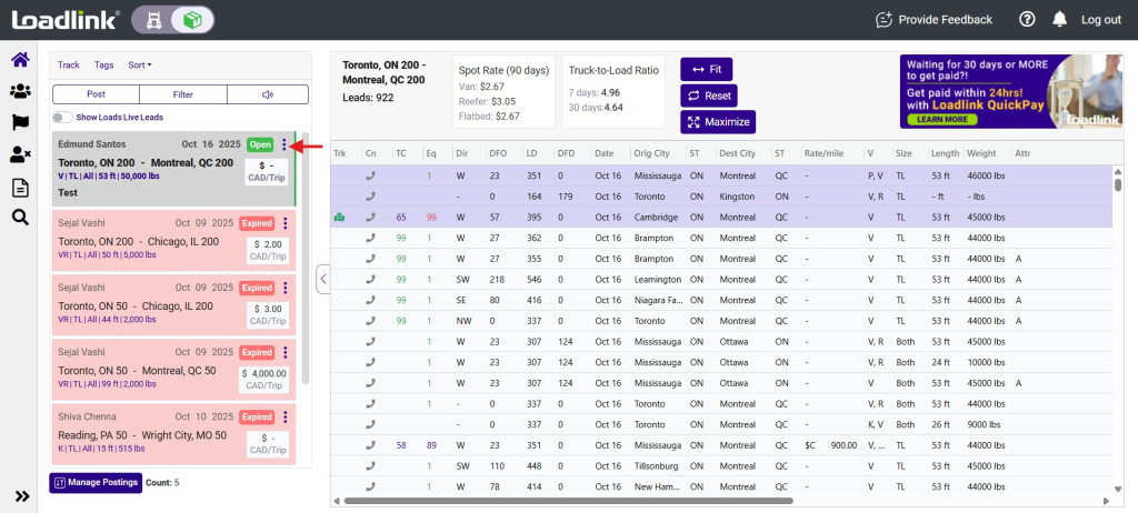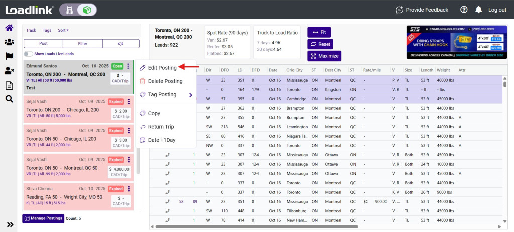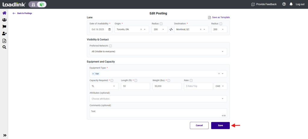 Home / Broker Load Board / Edit a Load PostingEdit a Load Posting To edit a load posting, move your cursor to the posting you want to edit. Click on the 3 dots to the right of the posting and select Edit Posting. 3. After clicking, you’ll be directed to the edit screen. Edit your load posting accordingly.4. Once finished, click the Save button to finish. Back to Broker Guides →