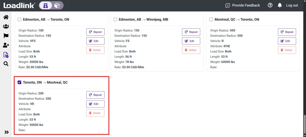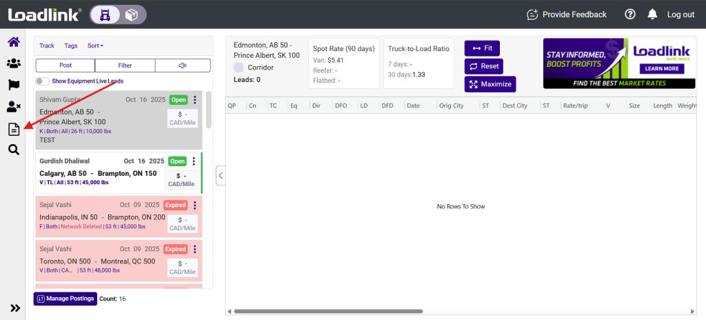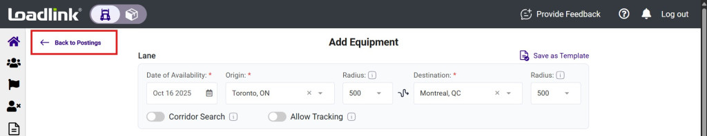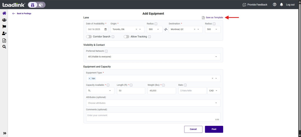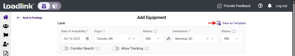 Home / Carrier Load Board / Save a Truck Posting TemplateSave a Truck Posting Template To create a truck posting template, navigate to the lefthand side and select Post. 2. After clicking, you’ll be directed to the posting menu. Proceed to fill your equipment details. 3. After filling in your details, navigate to the top-right corner and select Save as Template. 4. Once clicked, the checkmark indicates that the template has been saved successfully. 5. To view your truck posting templates, select Back to Postings to return to the Load board. 6. Navigate to the Templates symbol on the lefthand side. This is where all of your created truck posting templates will be stored. Back to Carrier Guides →